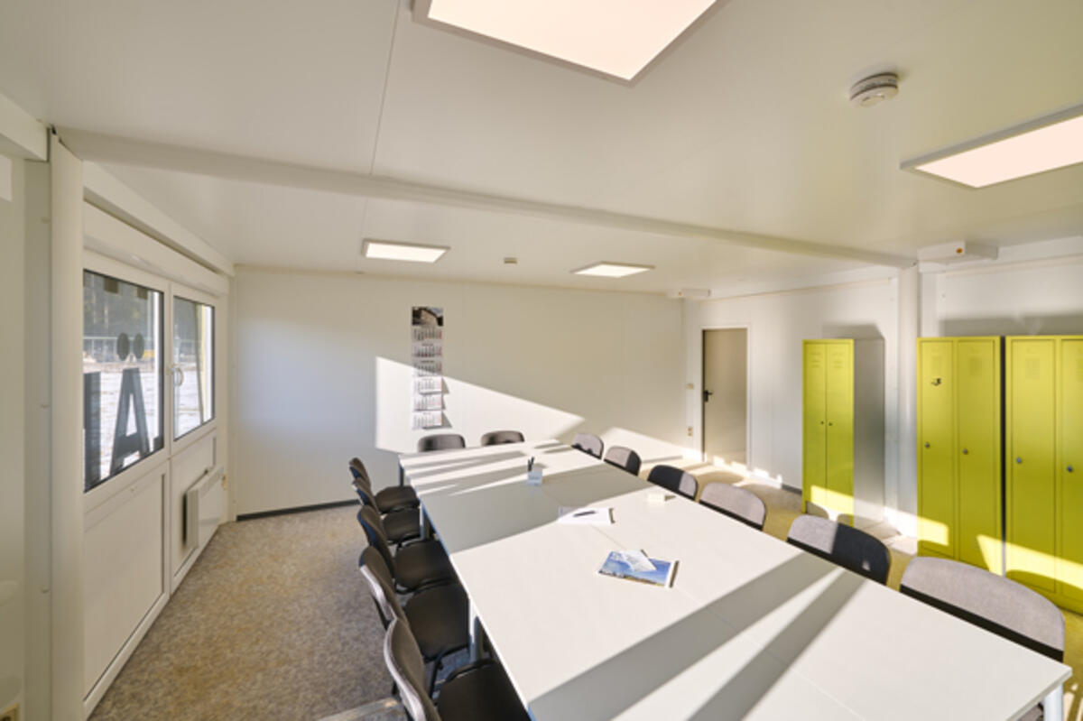 La coopération avec le client, par exemple pour la mise en œuvre d’exigences spéciales en matière d’aménagement extérieur, s’est également très bien déroulée. Les modules ELA ont ainsi été livrés dans une couleur jaune soufre et avec les films spéciaux, le logo et les éléments graphiques reprenant le design de la campagne THE LÄND. Des escaliers extérieurs en acier galvanisé relient les deux étages. Des murs blancs, de grandes baies vitrées et un éclairage LED garantissent un intérieur clair et accueillant. ELA Container a également fourni l’installation électrique, les éléments de chauffage et de protection contre les incendies ainsi que les détecteurs de fumée. Les espaces intérieurs sont équipés de tables, de chaises empilables rembourrées, d’armoires à dossiers coulissantes, de casiers doubles, de bancs et de vestiaires.